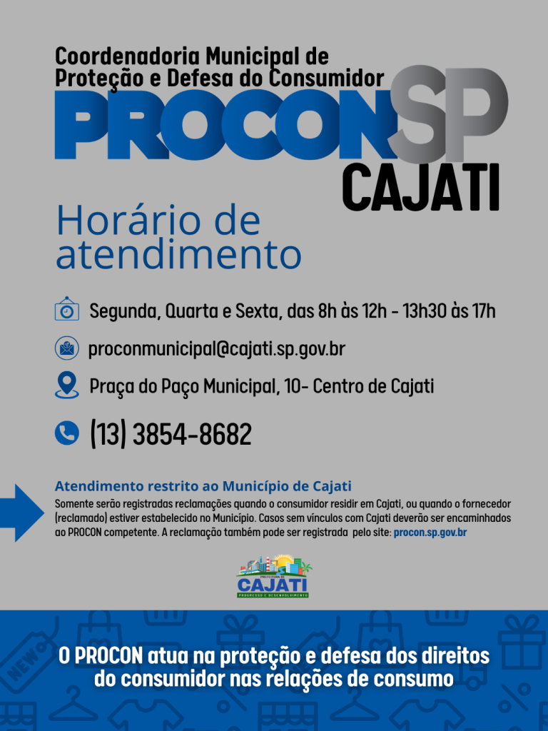 Somente serão registradas reclamações quando o consumidor residir em Cajati, ou quando o fornecedor (reclamado) estiver estabelecido no Município. Casos sem vínculos com Cajati deverão ser encaminhados ao PROCON competente. A reclamação também pode ser registrada pelo site: procon.sp.gov.br