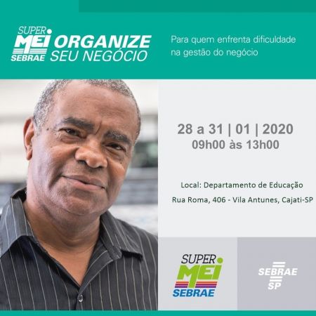 Nos dias 28 a 31 de janeiro, terça a sexta-feira, acontece o curso “Organize seu negócio”, pelo Super MEI Sebrae. Será ministrado das 9h às 13h, no Departamento Municipal de Educação. O curso é gratuito e voltado para microempreendedores que enfrentam dificuldade na gestão do negócio.