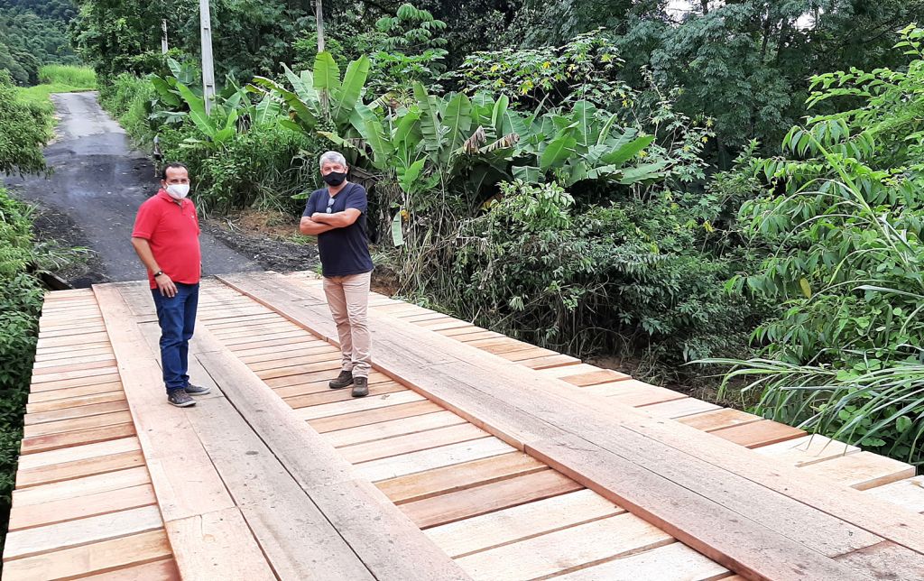 Na ponte da Vila Tatu, o prefeito de Cajati, Sidinei Ribeiro (esquerda), ao lado do diretor do Departamento de Serviços Municipais da Prefeitura de Cajati, Reinaldo de Oliveira.