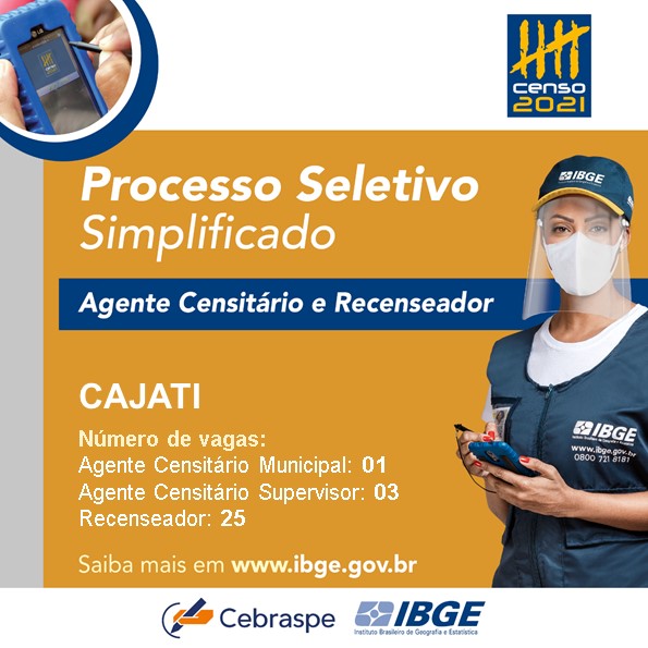 As inscrições para os recenseadores vão até o dia 19 de março, e para os agentes censitários, as inscrições ser encerram dia 15 de março. Em Cajati, são três vagas para agente censitário supervisor (acs), com remuneração mensal de R$ 1.700, uma para agente censitário municipal (acm), com ganho de R$ 2.100 mensais, e 25 vagas para recenseador, com remuneração por produção.