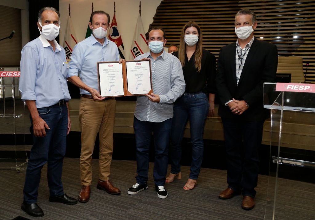 Da direita para a esquerda, o diretor do Centro de Atividades do Sesi, Flávio de Faria Alvim, a diretora de Tributação, Maíra Pedroso dos Santos, o prefeito de Cajati, Sidinei Ribeiro, o presidente da Federação das Indústrias do Estado de São Paulo (Fiesp), do Centro das Indústrias do Estado de São Paulo (Ciesp), do Serviço Social da Indústria (Sesi-SP), do Serviço Nacional de Aprendizagem Industrial (Senai-SP), do Instituto Roberto Simonsen (IRS) e do Serviço Brasileiro de Apoio às Micro e Pequenas Empresas (Sebrae/SP), Paulo Skaf, o diretor do Departamento de Educação e Cultura de Cajati, Maximo Ribeiro.