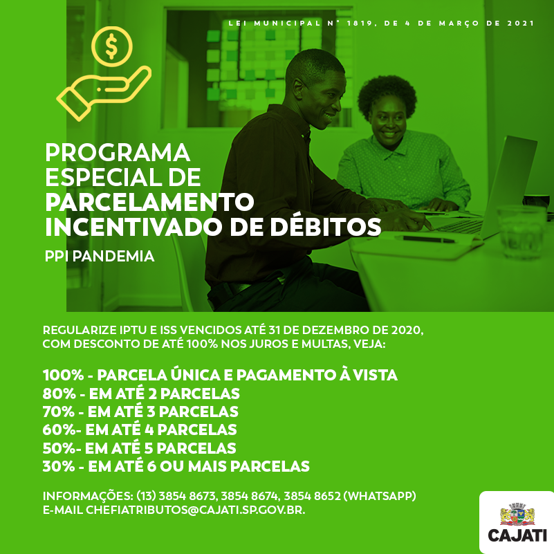 Com o intuito de amenizar os impactos econômicos decorrentes da pandemia do novo coronavírus, a Prefeitura de Cajati concede até 100% de desconto nos juros e multa de mora para as dívidas ativas ou não do Imposto Predial e Territorial Urbano (IPTU) e do Imposto Sobre Serviços (ISS), vencidos até 31 de dezembro de 2020, através do Programa Especial de Parcelamento Incentivado de Débitos- PPI Pandemia, que regulamenta os benefícios fiscais de acordo com a Lei municipal nº 1819, aprovada pela câmara de vereadores e sancionada pelo prefeito Sidinei Ribeiro em quatro de março de 2021.