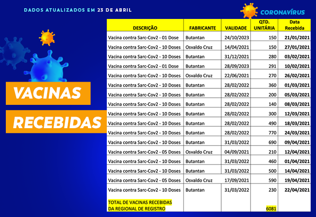 Nesta sexta-feira, 23 de Abril, Cajati totaliza 6081 doses de vacinas contra a Covid-19, recebidas do Departamento Regional de Saúde (DRS) e 4980 vacinas aplicadas contra a Covid-19, desde 22 de janeiro, quando aconteceu a primeira vacinação no município.