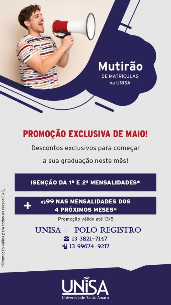 As matrículas estão abertas até 26 de maio e deverão acessar o site www.unisa.br ou ligue (13) 99674-9217 (Polo Registro).