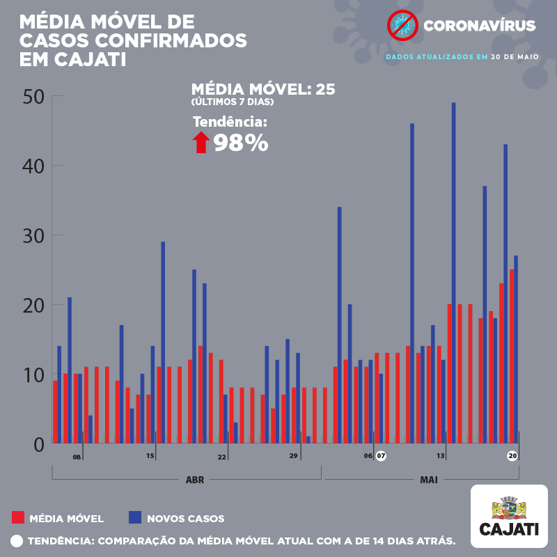 Para os casos confirmados da COVID-19, a média móvel em Cajati é de 20 novos casos por dia. A tendência está em alta de 98% em relação à média móvel de 14 dias atrás.