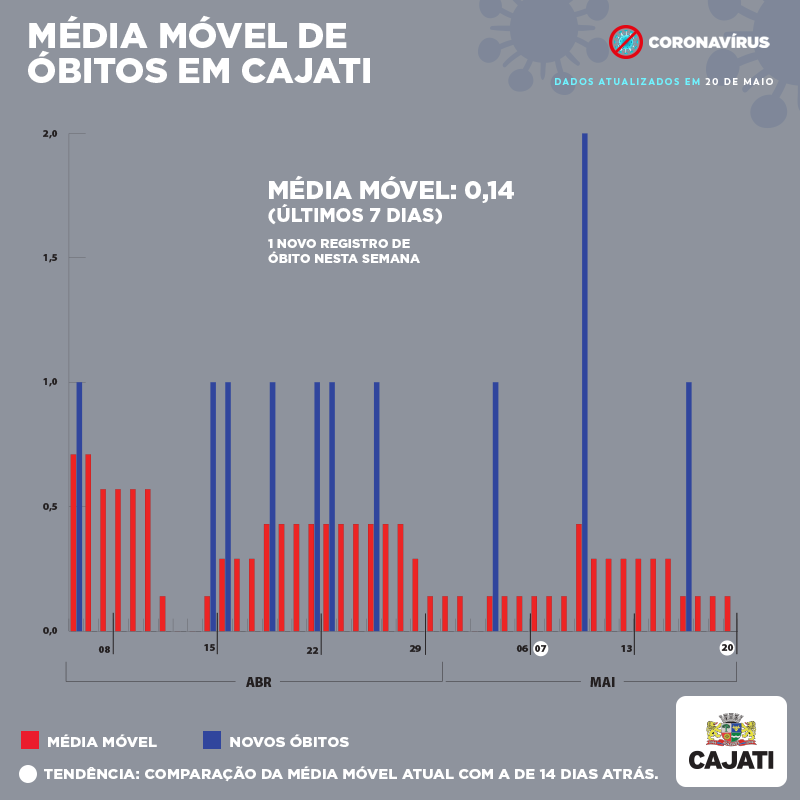 A Prefeitura de Cajati apresenta as médias móveis do coronavírus desta quinta-feira, 20 de maio.