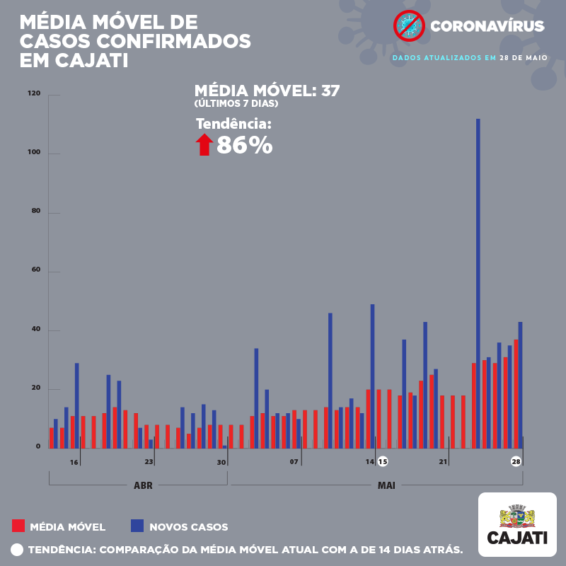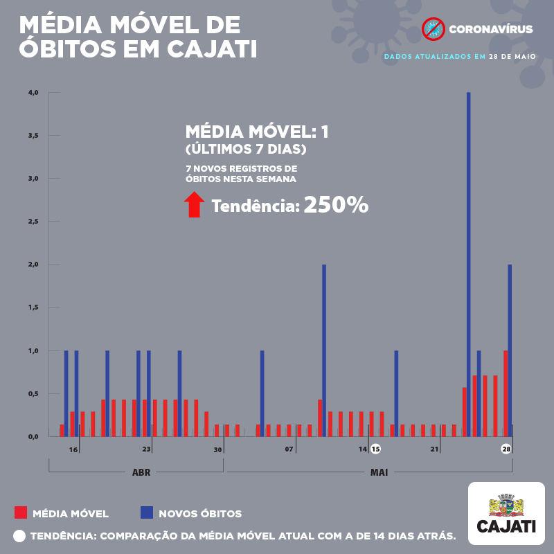 A Prefeitura de Cajati apresenta as médias móveis do Coronavírus desta sexta-feira, 28 de maio.