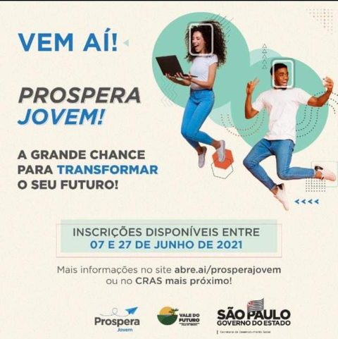 As inscrições para o 'Programa Prospera Jovem’ do Governo do Estado, através da Secretaria de Desenvolvimento Social estão abertas até o dia 27 de junho. Todos os jovens que estão na 2ª e 3ª séries do ensino médio da Rede Estadual de Ensino no Vale do Ribeira, cadastrados no Cadastro Único e com renda familiar de até meio salário mínimo por pessoa podem concorrer a vaga.