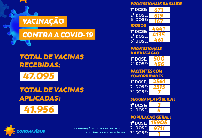 Nesta segunda-feira, 18 de outubro, Cajati totalizou 47.095  doses de vacinas contra a Covid-19, recebidas do Departamento Regional de Saúde (DRS) e 41.956 vacinas aplicadas contra a Covid-19, desde 22 de janeiro, quando aconteceu a primeira vacinação no município.