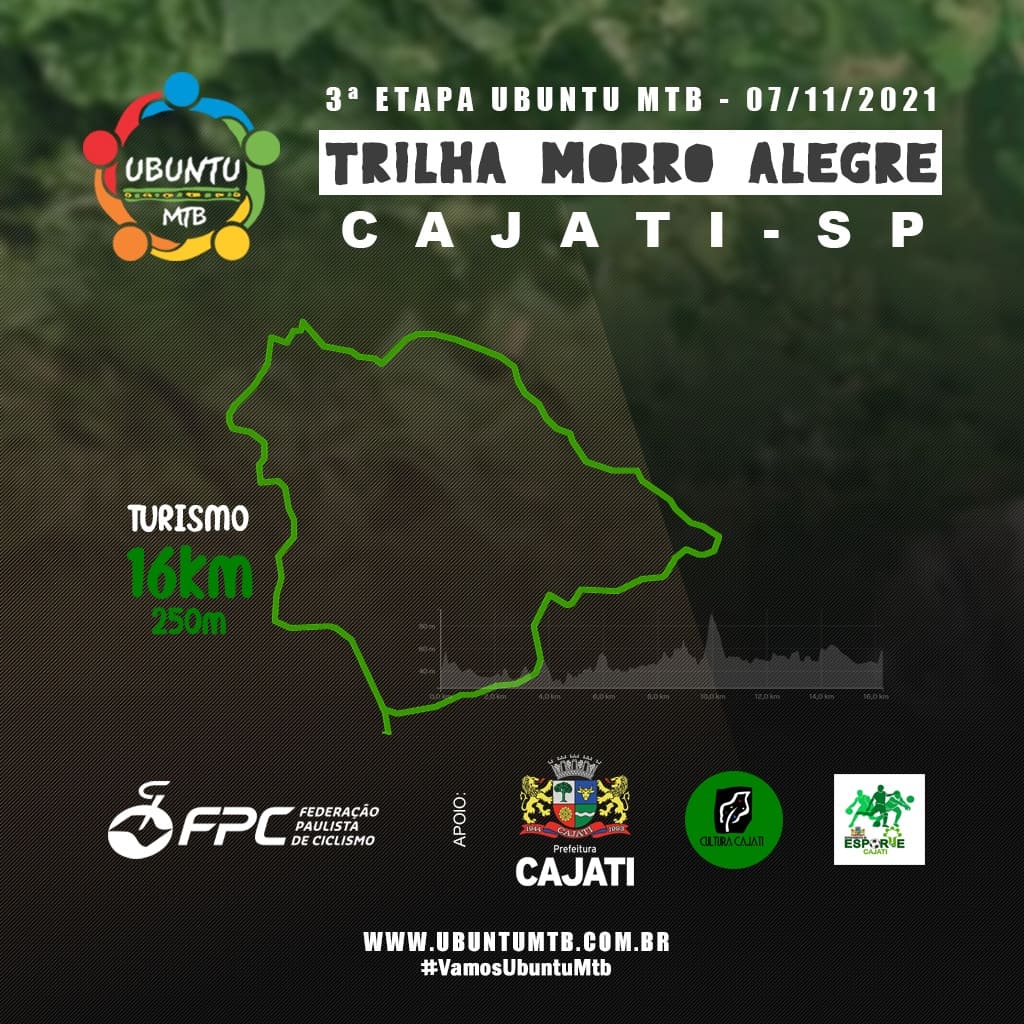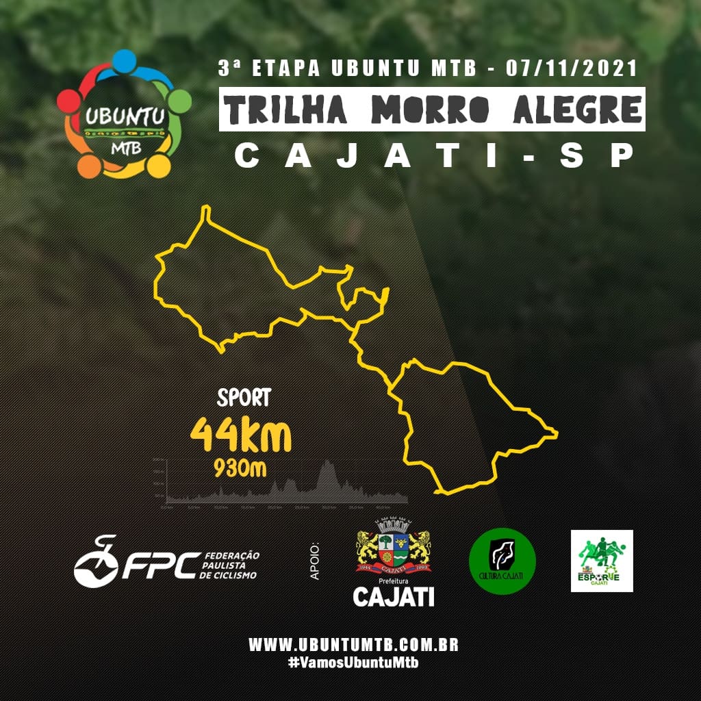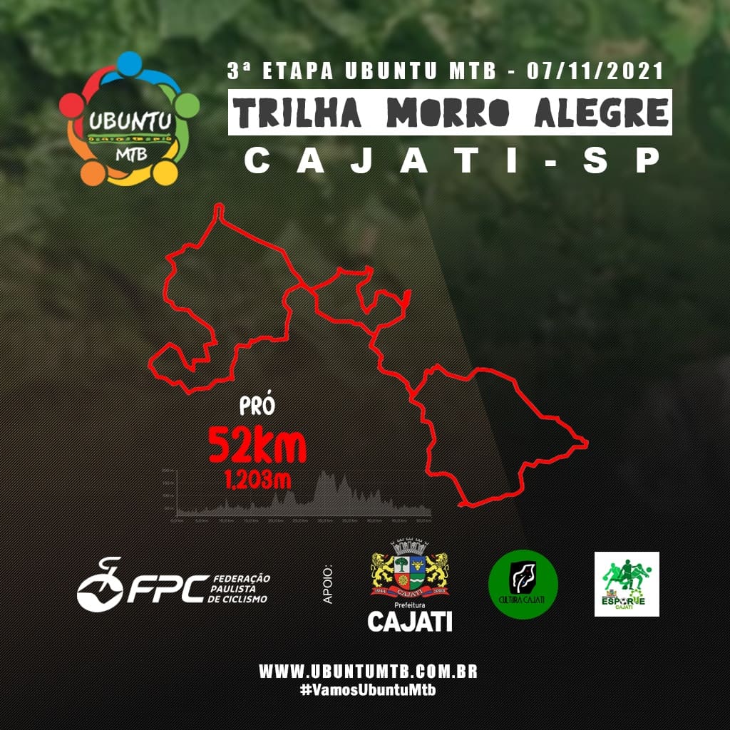 Os apaixonados por ciclismo já podem se animar!, a Ubuntu Moutain Bike em parceria com a Prefeitura de Cajati, Divisão de Cultura e departamento de esportes do município, realizará a 3ª etapa inédita do Circuito Ubuntu de Mtb, trilha Morro Alegre no dia 7 de novembro em Cajati, a partir das 9h.