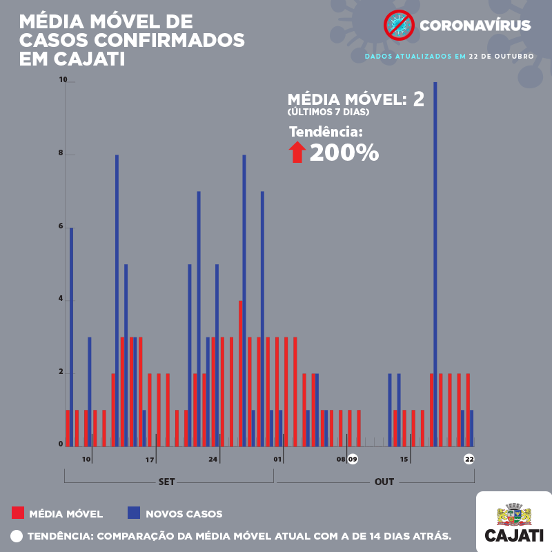 Para os casos confirmados da Covid-19, a média móvel em Cajati é de 2 novos casos por dia.  A tendência está em alta de 200% em relação à média móvel de 14 dias atrás.