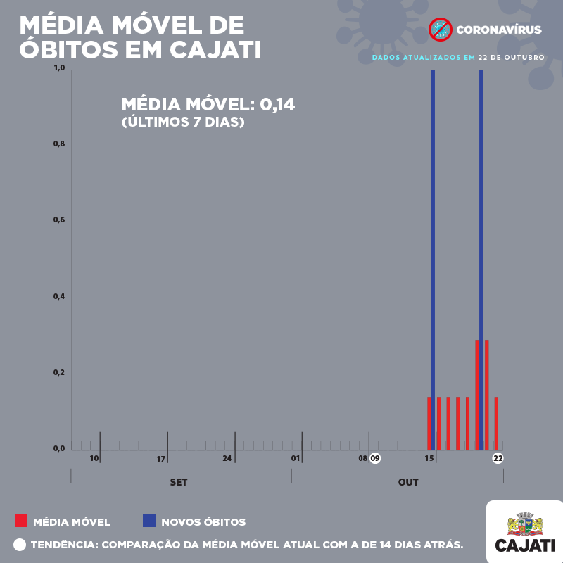 A Prefeitura de Cajati apresenta as médias móveis do Coronavírus desta sexta-feira, 22 de outubro. A média móvel de óbitos é de 0,14 novos registros por dia e o município teve 1 caso de morte pela doença nessa semana. A tendência para as mortes está nula em relação à média móvel de 14 dias atrás.