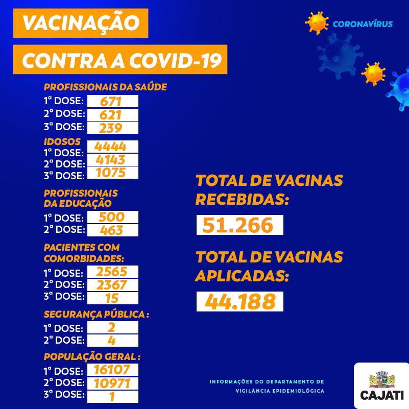 Nesta segunda-feira, 18 de outubro, Cajati totalizou 51.266  doses de vacinas contra a Covid-19, recebidas do Departamento Regional de Saúde (DRS) e 44.188 vacinas aplicadas contra a Covid-19, desde 22 de janeiro, quando aconteceu a primeira vacinação no município.