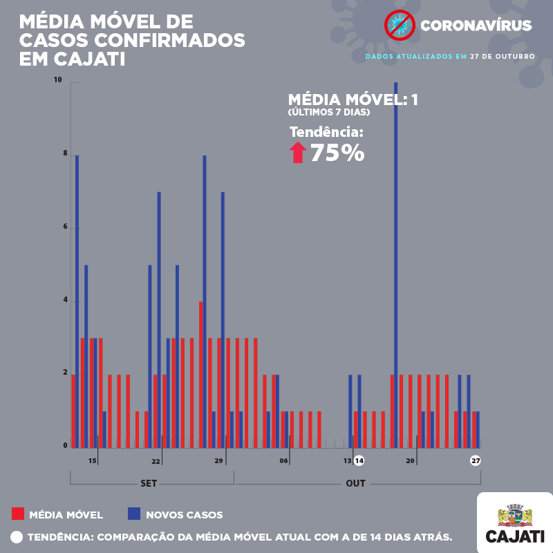 Para os casos confirmados da Covid-19, a média móvel em Cajati é de 1 novo caso por dia.  A tendência está em alta de 75% em relação à média móvel de 14 dias atrás.