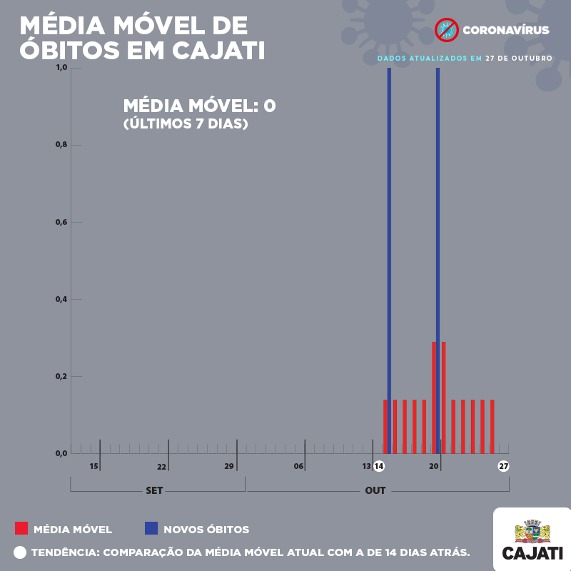 A Prefeitura de Cajati apresenta as médias móveis do Coronavírus desta quarta-feira, 27 de outubro. A média móvel de óbitos está nula e o município não teve morte pela doença nessa semana. A tendência para as mortes está nula em relação à média móvel de 14 dias atrás.