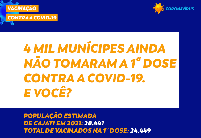 Nesta sexta-feira, 12 de novembro, Cajati totalizou 52.493 doses de vacinas contra a Covid-19, recebidas do Departamento Regional de Saúde (DRS) e 46.755 vacinas aplicadas contra a Covid-19, desde 22 de janeiro, quando aconteceu a primeira vacinação no município.