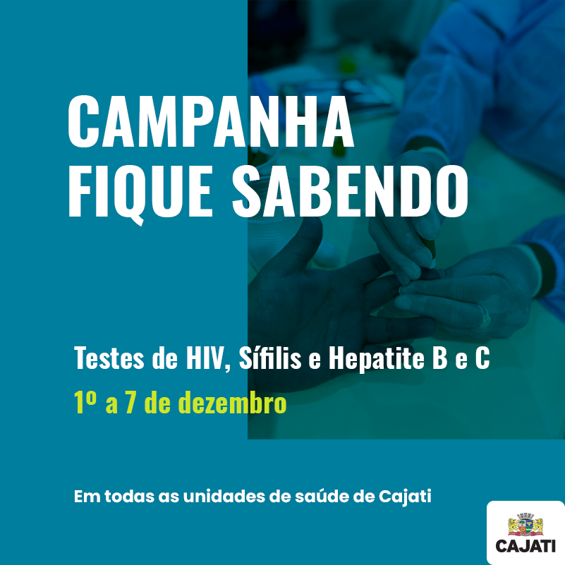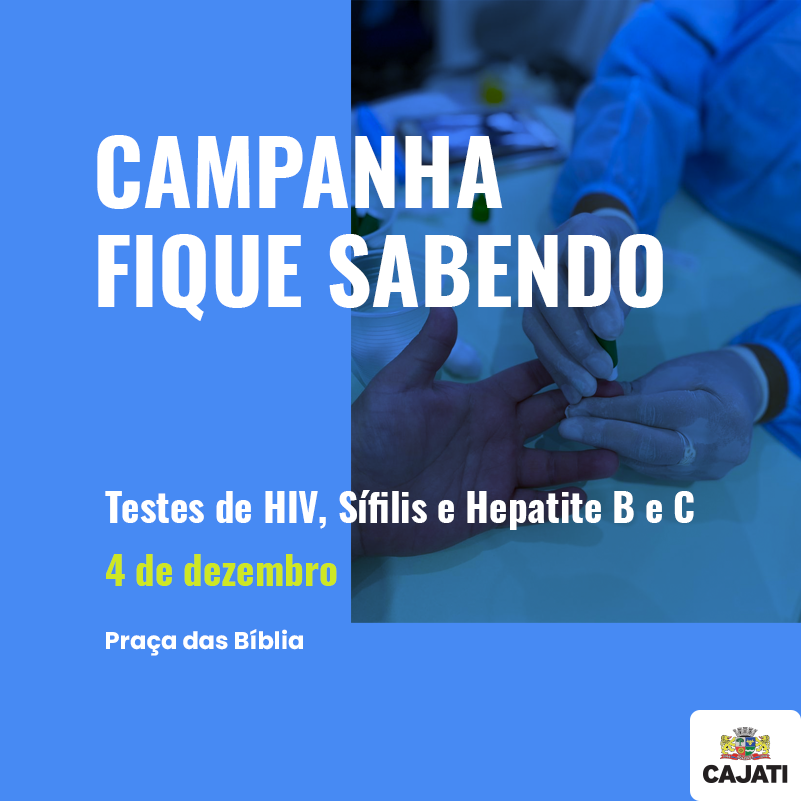 No dia 4º de dezembro, o Departamento de Saúde da Prefeitura de Cajati realizará das 8h às 14h, na Praça da Bíblia, a Campanha Fique Sabendo, de combate à Aids, Sífilis e Hepatites virais pela Divisão de Vigilância em Saúde / Vigilância Epidemiológica.