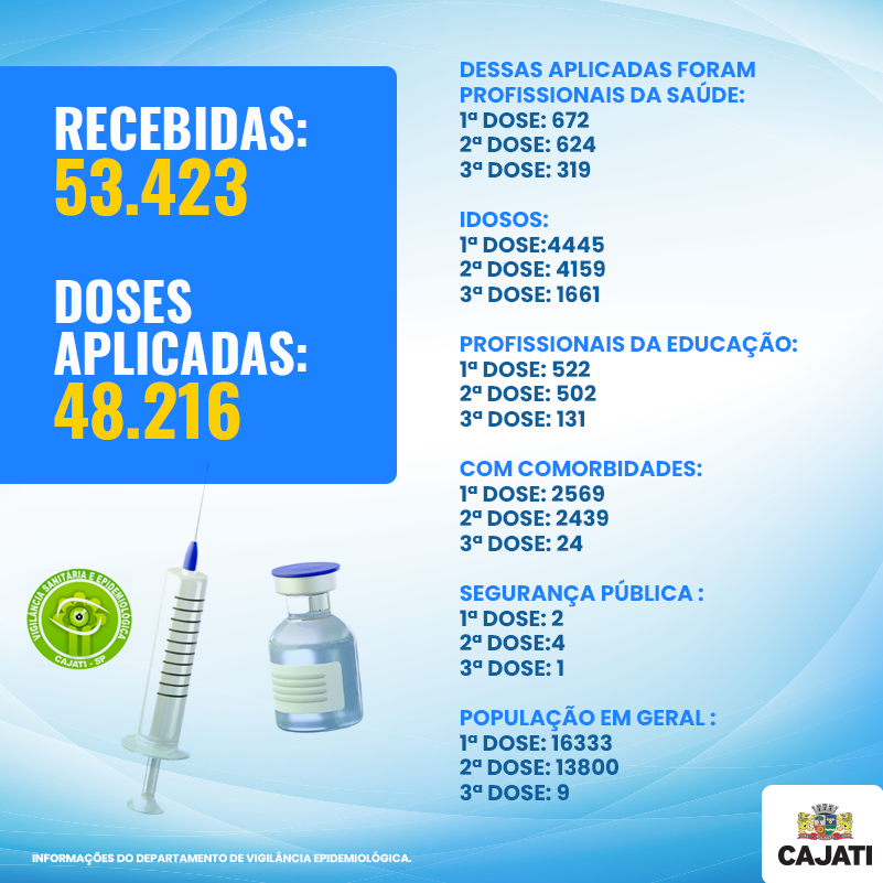 Nesta terça-feira, 30 de novembro, Cajati totalizou 53.423 doses de vacinas contra a Covid-19, recebidas do Departamento Regional de Saúde (DRS) e 48.216 vacinas aplicadas contra a Covid-19, desde 22 de janeiro, quando aconteceu a primeira vacinação no município.