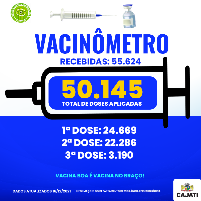 Nesta quinta-feira, 16 de dezembro, Cajati totalizou 55.624 doses de vacinas contra a Covid-19, recebidas do Departamento Regional de Saúde (DRS) e 50.145 vacinas aplicadas contra a Covid-19, desde 22 de janeiro, quando aconteceu a primeira vacinação no município.