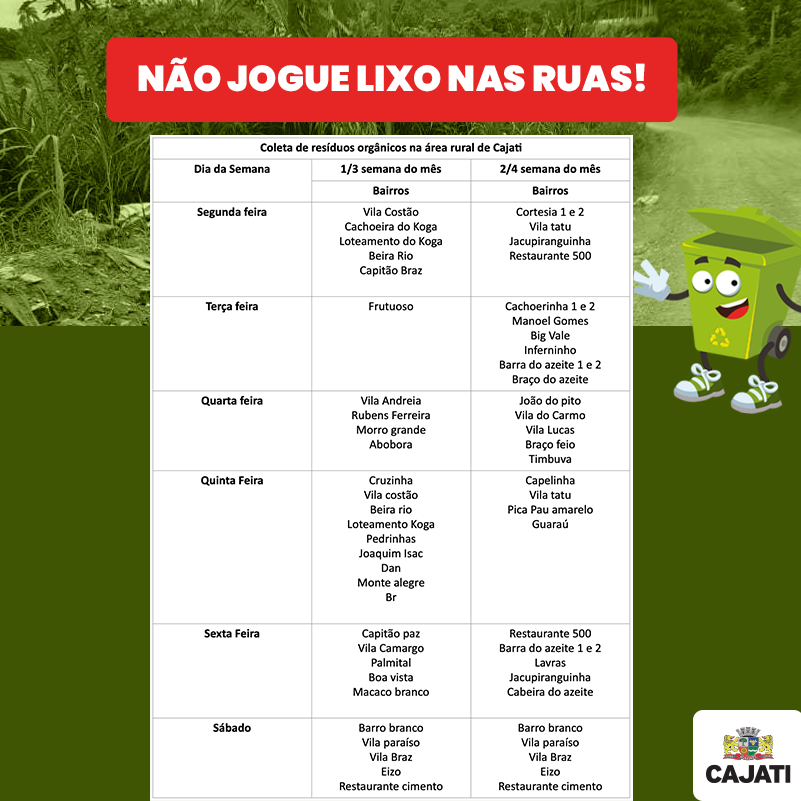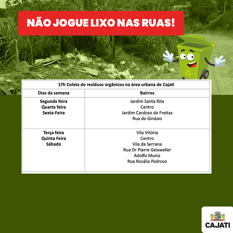A Prefeitura de Cajati adotou as medidas preventivas para os lixos serem descartados em locais adequados e de uma forma correta e instalou no município 30 conjuntos de tambores para a separação de materiais recicláveis, divididos em papel, plástico, metal e vidro e também realiza a coleta seletiva nos bairros.