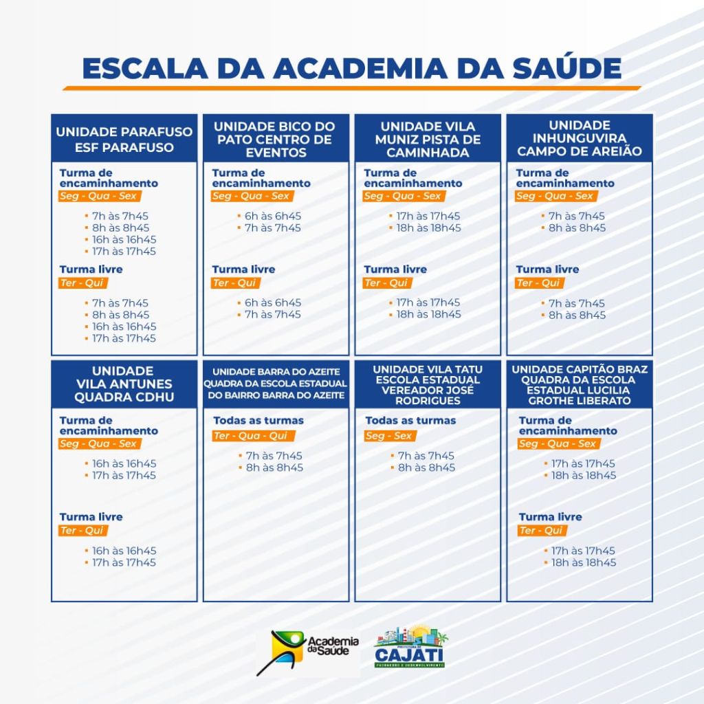 A Academia da Saúde foi reinaugurada no dia 3 de junho, no bairro Parafuso e contou com a presença de diversos representantes da saúde do Município, os novos colaboradores da Prefeitura de Cajati que são os profissionais de Educação Física que já estão na ativa incentivando a população a se exercitar. As 9 unidades da Academia da Saúde estão alocadas próximas as Unidades de Saúde e instituições escolares.