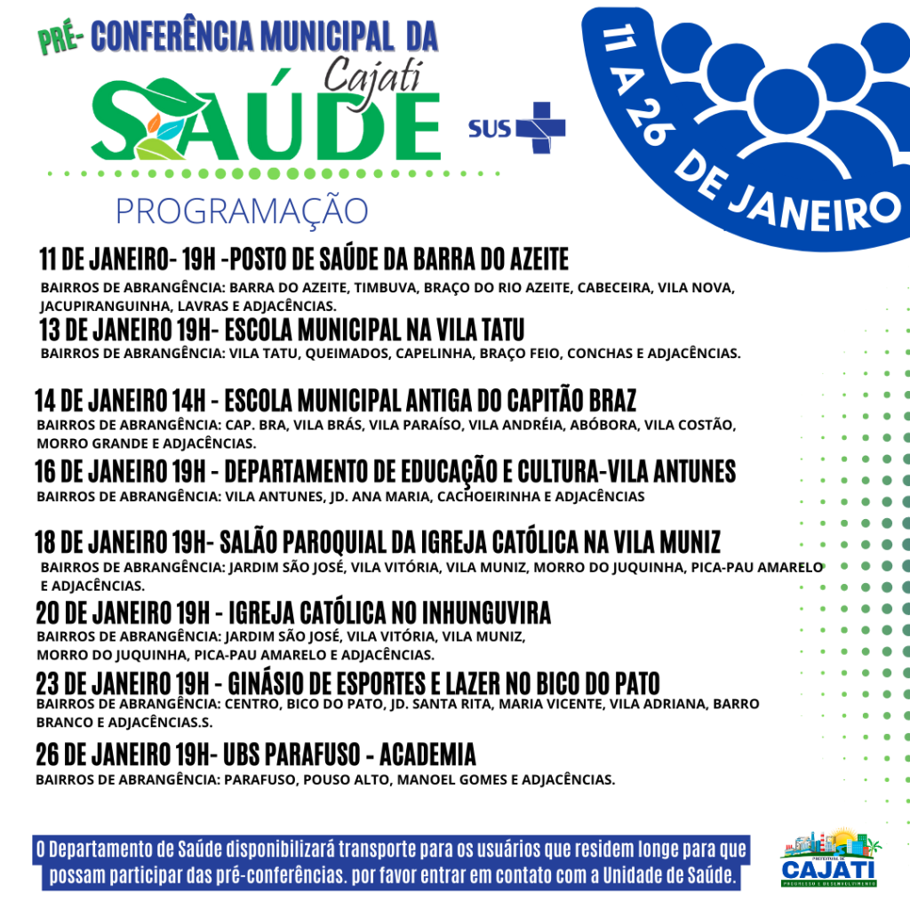 O Departamento de Saúde da Prefeitura de Cajati convida os cajatienses para participarem das pré-conferências que acontecerão de 11 a 27 de janeiro nos bairros do Município.