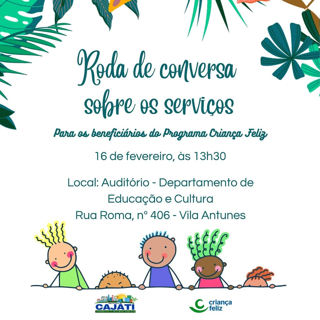 O Departamento de Desenvolvimento e Assistência Social através da equipe do Programa Criança Feliz-PCF, irá realizar hoje, dia 16 de fevereiro, a ação “Roda de Conversa Sobre os Serviços”, das 13h30 às 17h, no auditório do Departamento de Educação e Cultura.