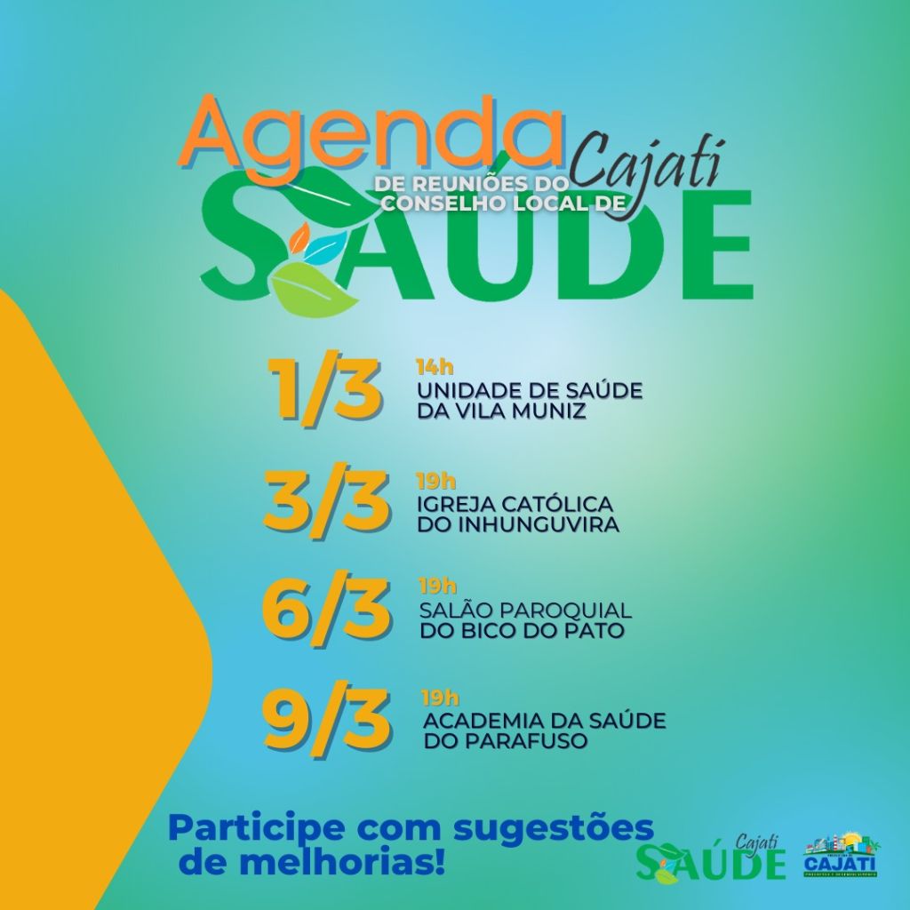 As reuniões dos Conselhos Locais de Saúde ocorrerão nos bairros Vila Muniz, Bico do Pato, Parafuso, Capitão Braz, Vila Antunes, Inhuguvira, Barra do Azeite e Vila Tatu. Procure a sua Unidade de Saúde para informar-se em relação às datas, locais e horários, ou fique atento aos meios de comunicação da Prefeitura de Cajati.