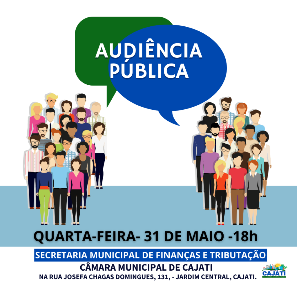 A Secretaria Municipal de Finanças e Tributação convida a população cajatiense para assistir a Audiência Pública de Demonstração e Avaliação do Cumprimento de Metas Fiscais estabelecidas na Lei de Diretrizes Orçamentárias, referente ao 1º Quadrimestre de 2023, do Município de Cajati, que acontecerá na próxima quarta-feira, 31 de maio, às 18h.