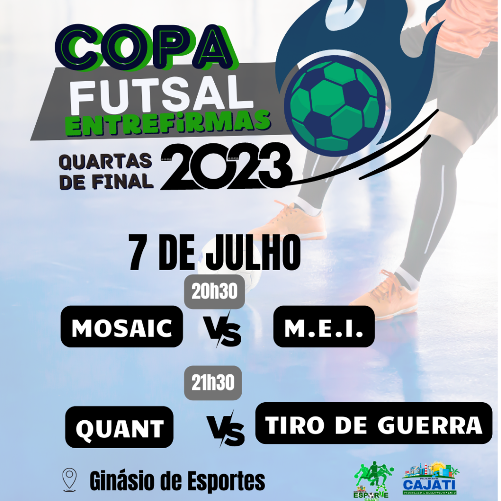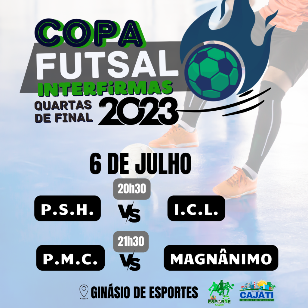 A Secretaria de Esporte e Lazer convida os cajatienses para prestigiarem as partidas de quartas de finais da Copa Interfirmas de Futsal 2023, que acontecerão nesta quinta-feira e sexta-feira, dias 6 e 7 de julho no Ginásio de Esportes Luís Carlos Felizardo Rodrigues (Tatu).