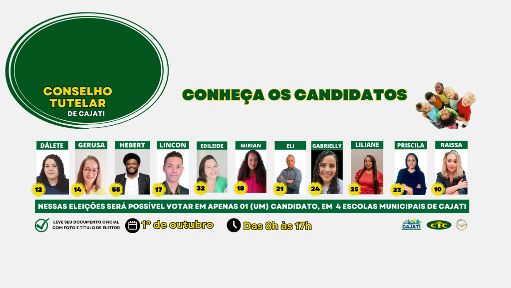 A Prefeitura de Cajati, através do Conselho Municipal dos Direitos da Criança e Adolescente(CMDCA), anuncia os 11 candidatos que disputam as vagas para Conselheiros Tutelares no Município.