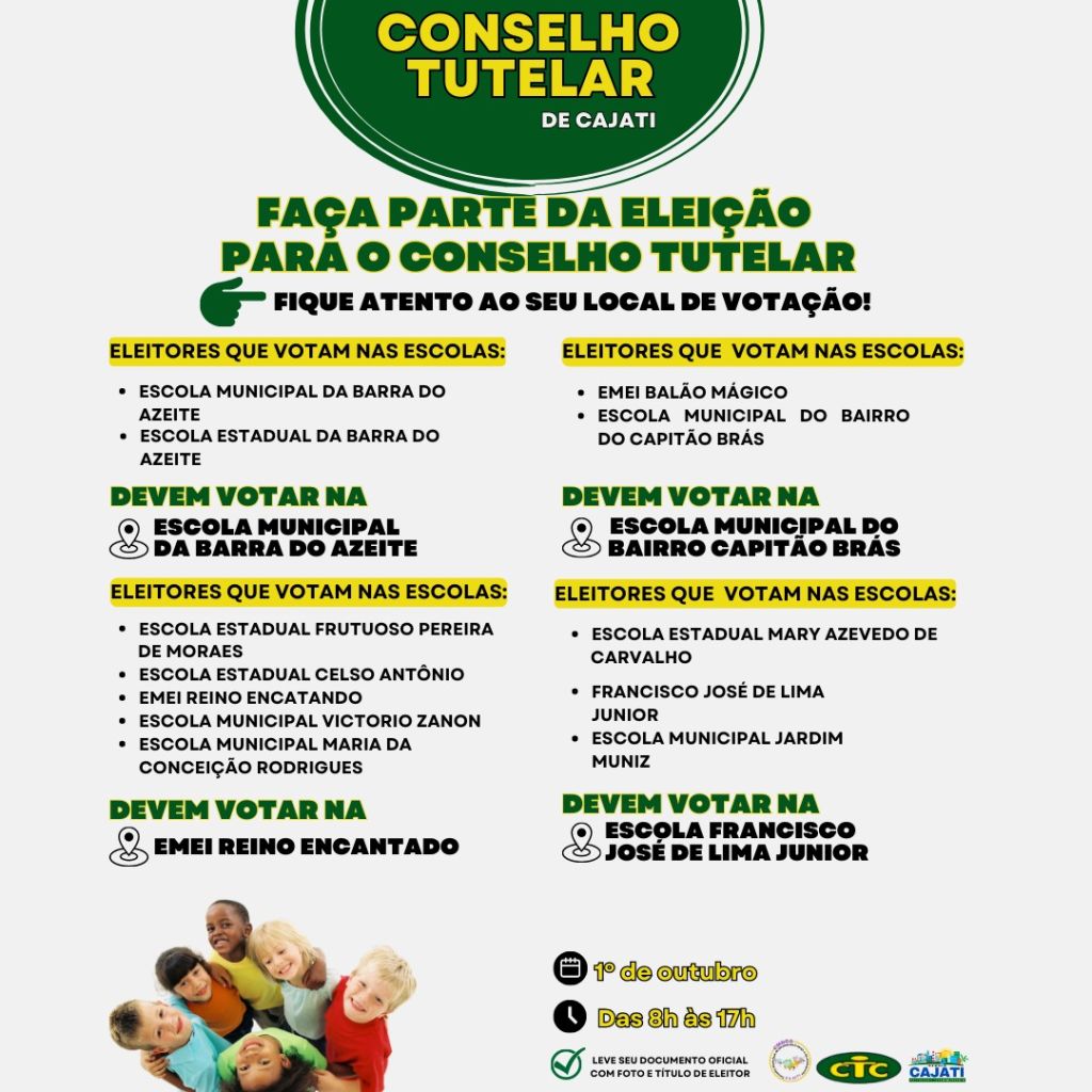 A votação acontecerá no dia 1º de outubro, com horário de votação das 8h às 17h, em 4 escolas municipais de Cajati.