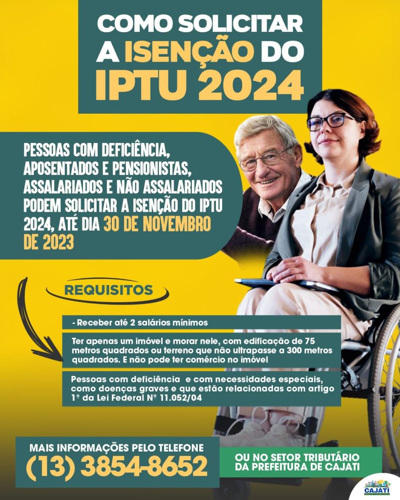 Pessoas com deficiência, aposentados e pensionistas, assalariados e não assalariados com renda até dois salários mínimos mensais, e que possuam um único imóvel com edificação de 75 metros quadrados, desde que o tenham como moradia própria e para sua família e que a área do respectivo terreno não ultrapasse a 300 metros quadrados podem solicitar a isenção do IPTU 2024, até 30 de novembro de 2023.