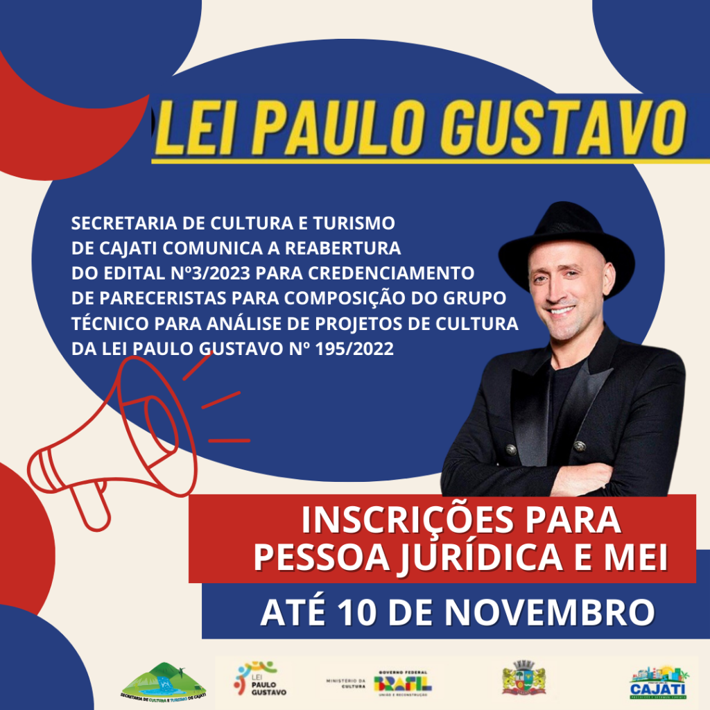 Secretaria de Cultura e Turismo de Cajati comunica a reabertura do Credenciamento de Pareceristas através do Edital Nº3/2023, para a composição do grupo técnico para análise de projetos de Cultura da Lei Paulo Gustavo Nº 195/2022.