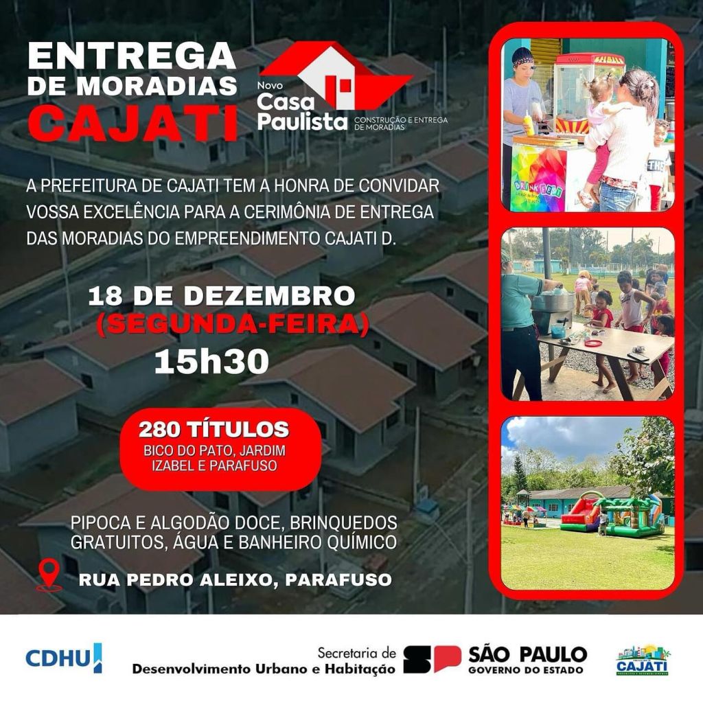 Nesta segunda-feira (18/12) às 15h30, será um dia memorável e de alegria para os novos moradores do Empreendimento Cajati D, a CDHU e a Prefeitura de Cajati realizarão na ocasião a entrega das chaves para as 65 famílias sorteadas.
