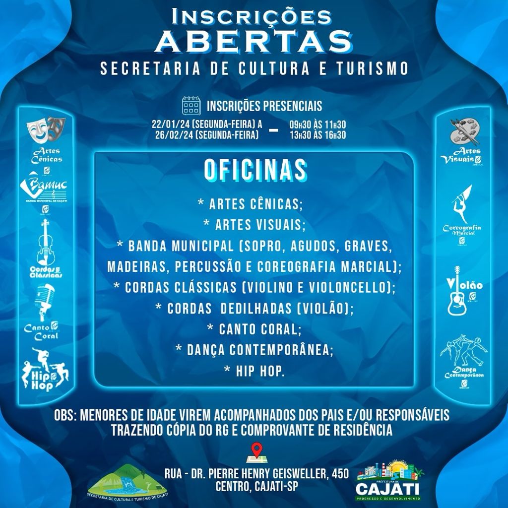 A Secretaria de Cultura da Prefeitura de Cajati informa que as inscrições para as suas Oficinas Gratuitas podem ser realizadas 6 de fevereiro, de segunda a sexta das 9h30 às 11h30 e da 13h30 às 16h30, pelo formulário: https://forms.gle/otot7ijc8FVgAT697 , ou na sede da instituição, que fica localizada na rua Dr. Pierre H. Geisweller, nº 450 – Centro – Cajati/SP.