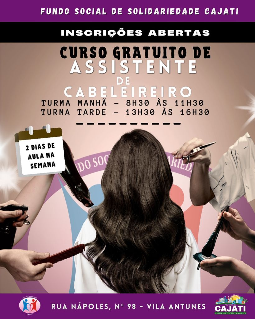 O Fundo Social de Solidariedade de Cajati comunica que no período de 15 à 26 de Janeiro de 2024, estarão abertas as inscrições para o curso gratuito de Assistente de Cabeleireiro