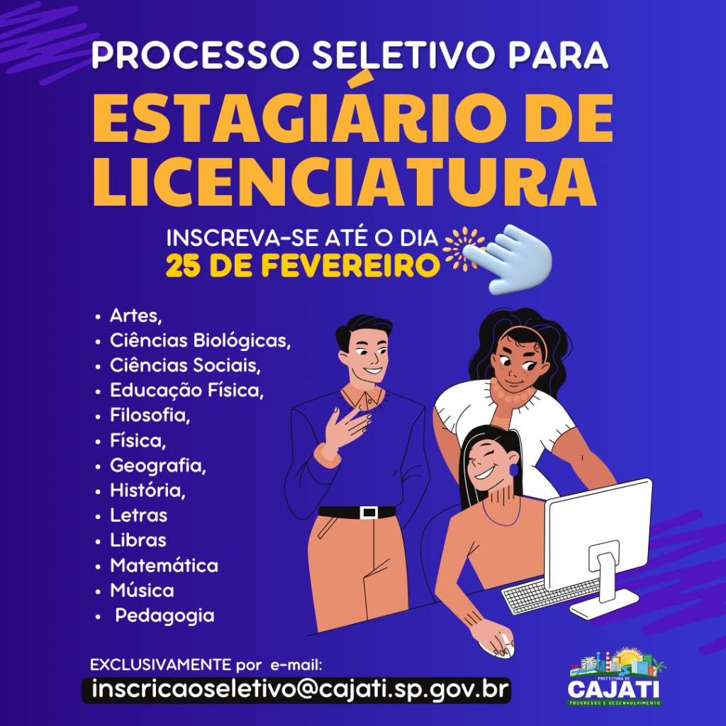 A Prefeitura de Cajati, através da Divisão de Gestão de Pessoas informa que estão abertas as inscrições do Processo Seletivo para formação de Cadastro de Reserva para o “Estágio não obrigatório”, a estudantes que estejam frequentando o 3º semestre de Curso Superior de