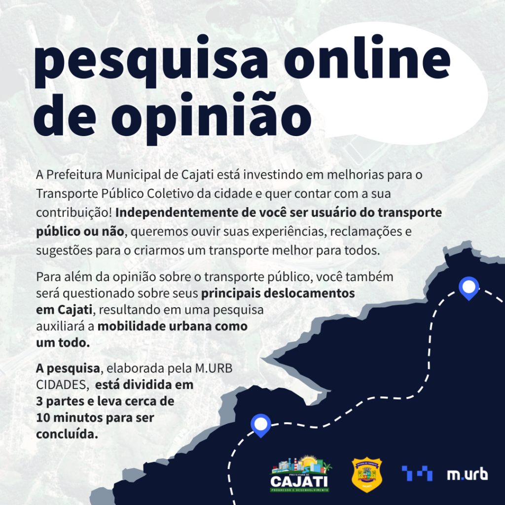 Para além da opinião sobre o transporte público, você também será questionado sobre seus principais deslocamentos em Cajati, resultando em uma pesquisa auxiliará a mobilidade urbana como um todo. A pesquisa, elaborada pela M.URB CIDADES, está dividida em 3 partes e leva cerca de 10 minutos para responder.