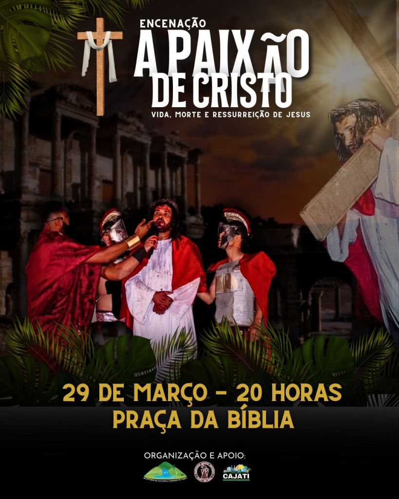 No dia 29 de março-sexta-feira, às 20h, a Secretaria de Cultura da Prefeitura de Cajati e a Paróquia Santo Antônio realizarão a apresentação da Paixão de Cristo, na Praça da Bíblia.
