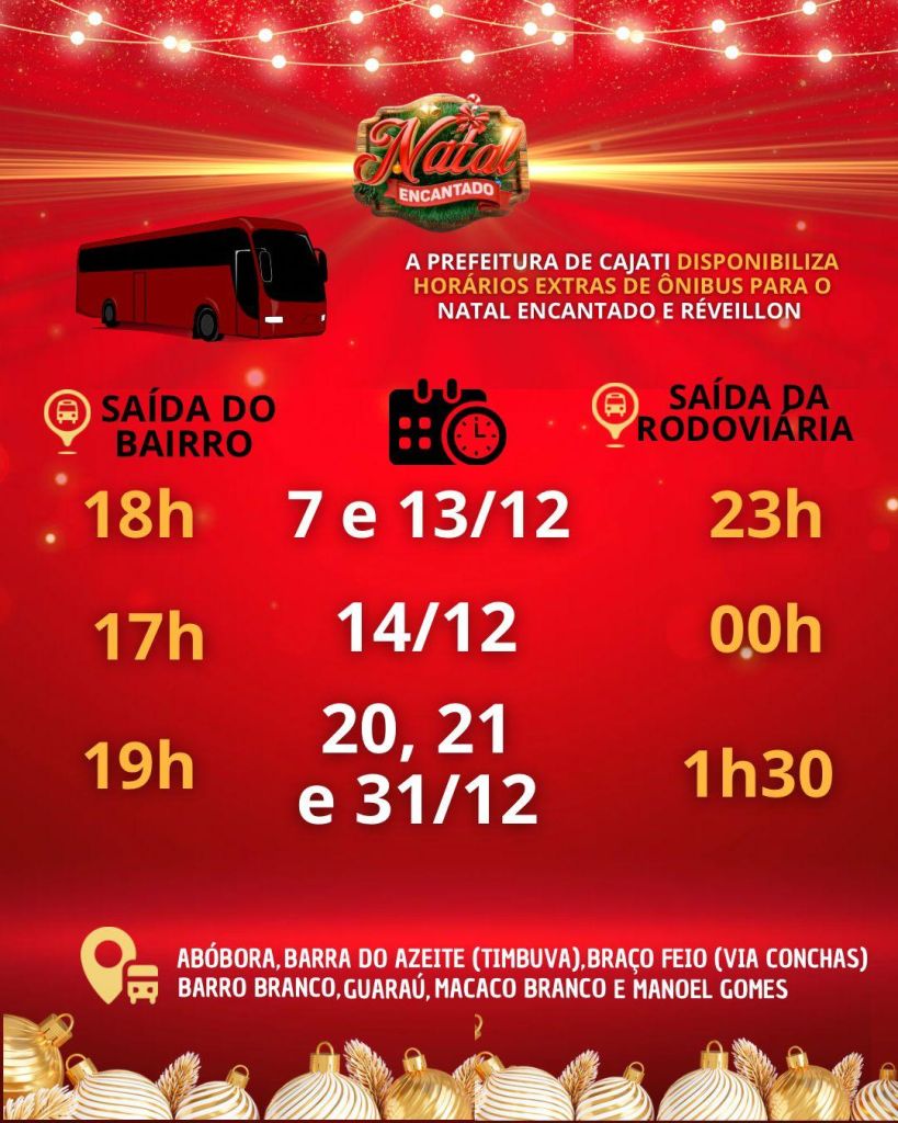 E o tradicional ônibus do Natal também estará circulando em Cajati nos dias 13 e 14 de dezembro, com partidas da Praça da Bíblia, a partir das 19h30. Os passageiros poderão ver toda beleza da cidade, que está encantada!