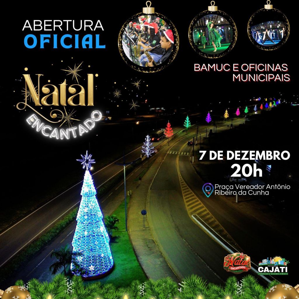 A Prefeitura de Cajati, através da Secretaria de Cultura vai abrir as programações do Natal Encantado neste sábado, 7 de dezembro, às 20h, com apresentação da Banda Municipal de Cajati (BAMUC), com o tema: “Melodias sem Fronteiras: Uma Viagem Musical", um espetáculo que propõe uma imersão em sons e ritmos que atravessam barreiras geográficas, culturais e emocionais, apresentado pelos talentos das Oficinas que são ofertadas aos munícipes gratuitamente durante o ano.