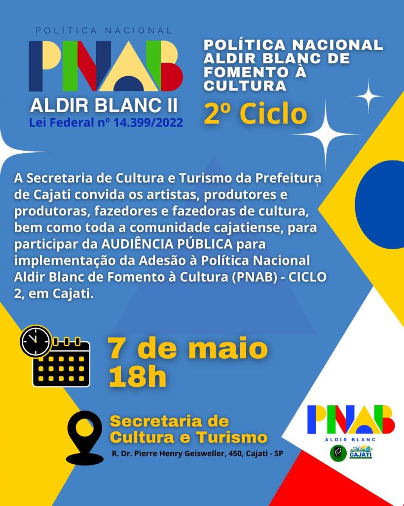 A Prefeitura de Cajati, por meio da Secretaria de Cultura e Turismo, convoca os artistas, produtores e produtoras, fazedores e fazedoras de cultura, bem como toda a comunidade cajatiense para participarem da Audiência Pública para Implementação da Política Nacional Aldir Blanc II (PNAB)- Ciclo 2, que acontecerá no dia 7 de maio, às 18 horas, na Secretaria de Cultura e Turismo do Município.