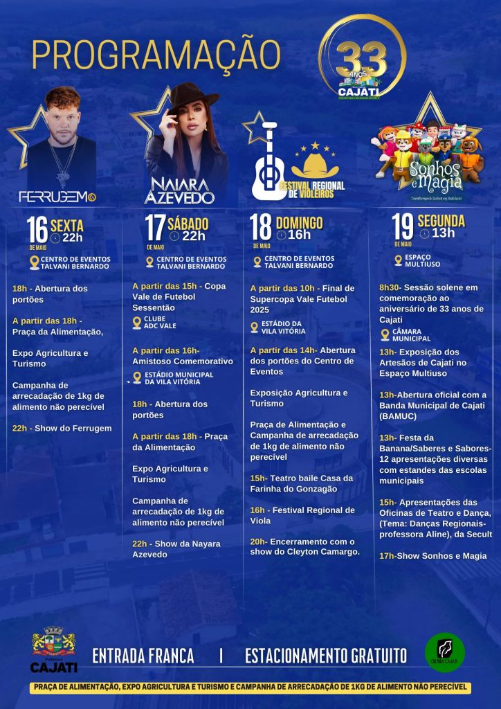 Segue a Programação de Aniversário de Emancipação política Administrativa do Município de Cajati