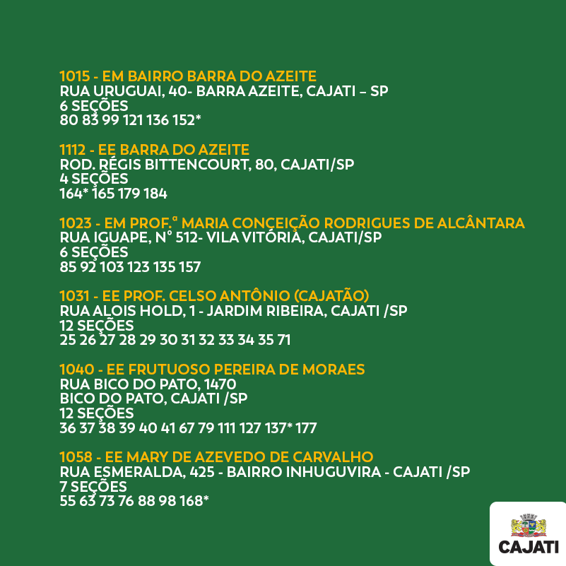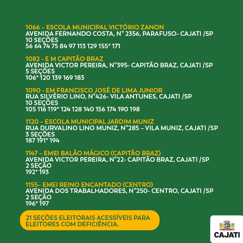Cajati tem 12 locais de votação e 79 seções eleitorais, sendo 21 delas acessíveis para eleitores com deficiência. O cartório da 228ª Zona Eleitoral – Jacupiranga é o responsável pelas eleições do município.
