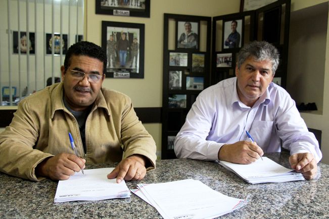 O prefeito de Cajati, Vavá Cordeiro (à direita) e o presidente da Câmara Municipal de Cajati, Geraldo Divino de Oliveira no dia da assinatura de 101 títulos de domínio que beneficiarão moradores do bairro Jardim Cardoso de Freitas (Foto: Zenilson Oliveira).