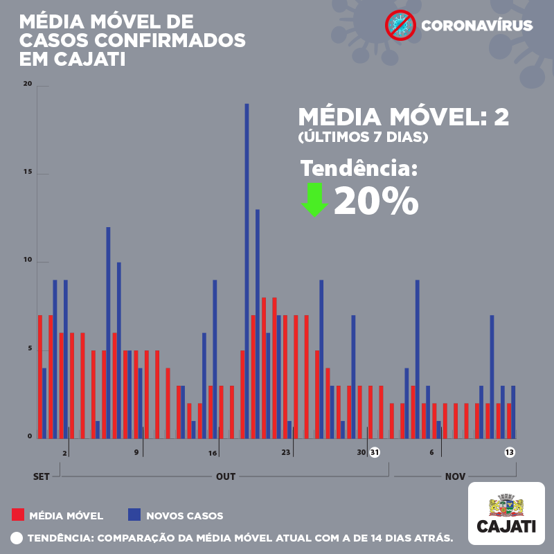 Para os casos confirmados da COVID-19, a média móvel em Cajati é a mesma da semana passada, 2 novos casos por dia. A tendência está em queda de 20% em relação à média móvel de 14 dias atrás.