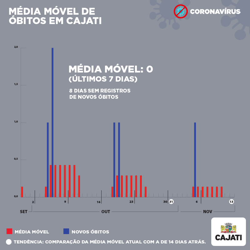 A Prefeitura de Cajati apresenta as médias móveis do coronavírus desta sexta-feira, 13 de novembro. A média móvel de óbitos está nula e há 8 dias o município não tem novos registros de mortes pela doença.