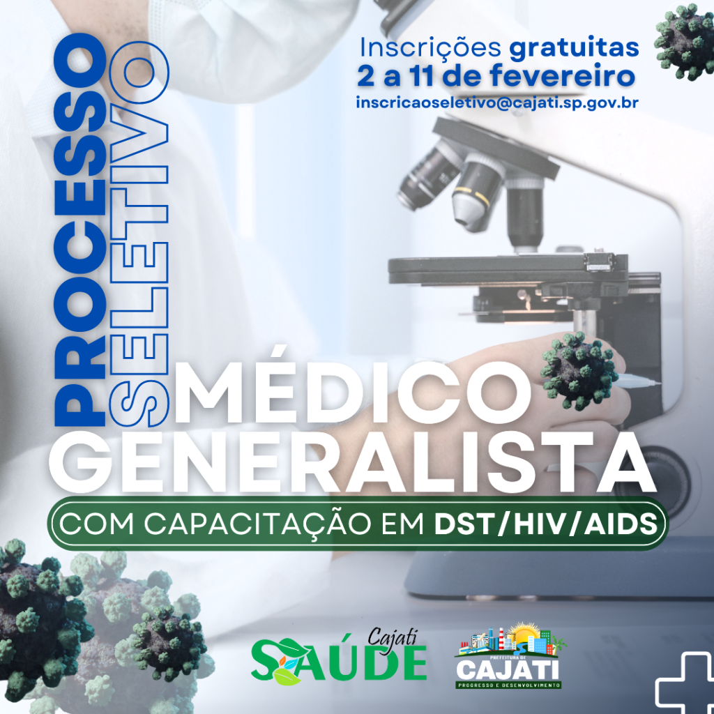 A Prefeitura de Cajati, através da Secretaria de Saúde informa que estão abertas as inscrições gratuitas para o Processo Seletivo para contratação imediata de um Médico Generalista com Capacitação em DST/HIV/AIDS, até às 23h59 do dia 11 de fevereiro, exclusivamente via internet, através do e-mail: pelo inscricaoseletivo@cajati.sp.gov.br.