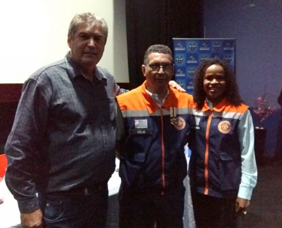 O homenageado, coordenador adjunto regional e municipal de proteção e defesa civil, Célio de Farias (centro) recebe honraria pelo seu trabalho no município de Cajati, entregue pelo Prefeito Vavá e pela coronel da Polícia Militar, coordenadora estadual de defesa civil e secretária chefe da Casa Militar, Helena dos Santos Reis.